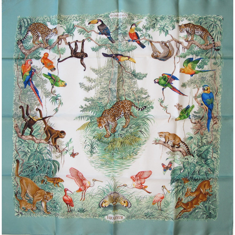 Stunning Hermès Twill scarf with its original crispy touch, Made in France, model Equateur designed in 1984 by Robert dallet and issued here in its first issue. Fantastic and fairy jungle world, it will enjoy a fan, the celadon palette is also superb. Don't miss it!